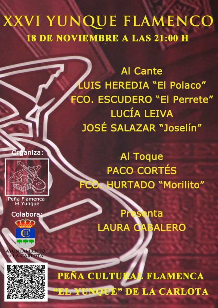 Durante los años 2023, 2024 y 2025, la Peña Cultural Flamenca El Yunque de La Carlota ha consolidado una programación artística rica y diversa, que reafirma su compromiso como un referente del flamenco tradicional andaluz en la comarca. Estos tres años han estado marcados por una cuidadosa selección de eventos que combinan la energía de los nuevos talentos del cante, la guitarra y el baile, junto con la presencia de artistas consagrados que mantienen viva la esencia del arte jondo.