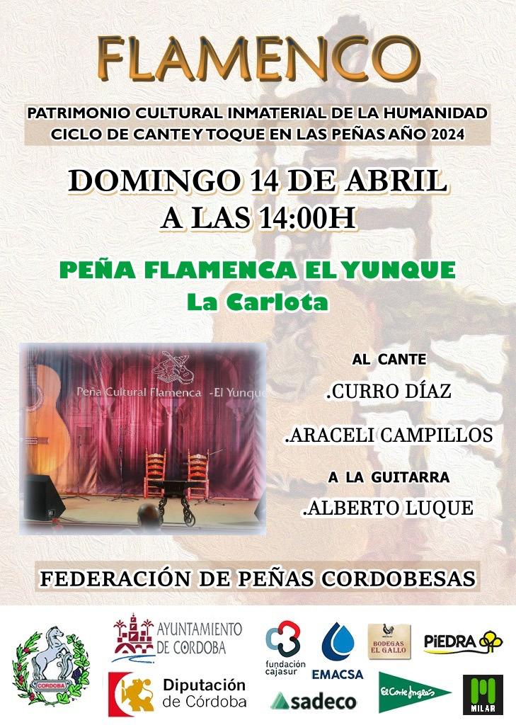 Durante 2024, la Peña Cultural Flamenca El Yunque en La Carlota (Córdoba) mantuvo su labor constante en la difusión y promoción del flamenco tradicional mediante una cartelería que refleja la riqueza y diversidad del arte jondo andaluz. Los carteles diseñados para los eventos y actividades del año muestran una identidad visual clara y emotiva, que conecta profundamente con la esencia y el sentimiento del flamenco auténtico.