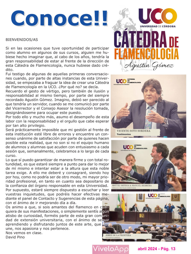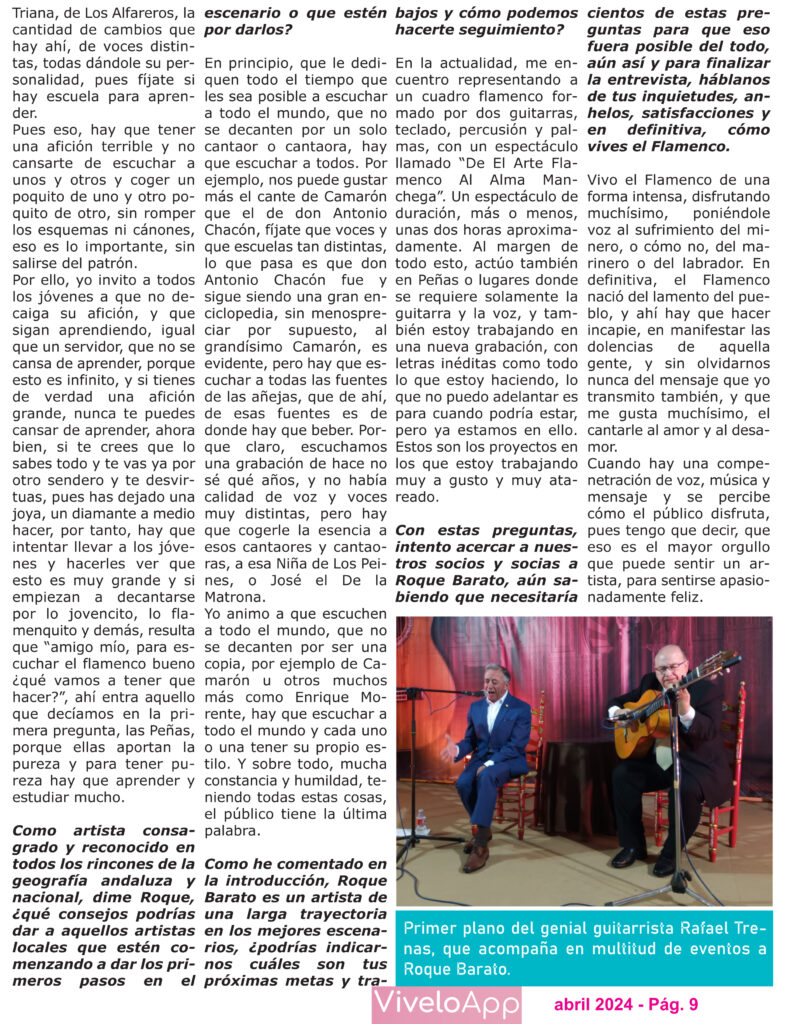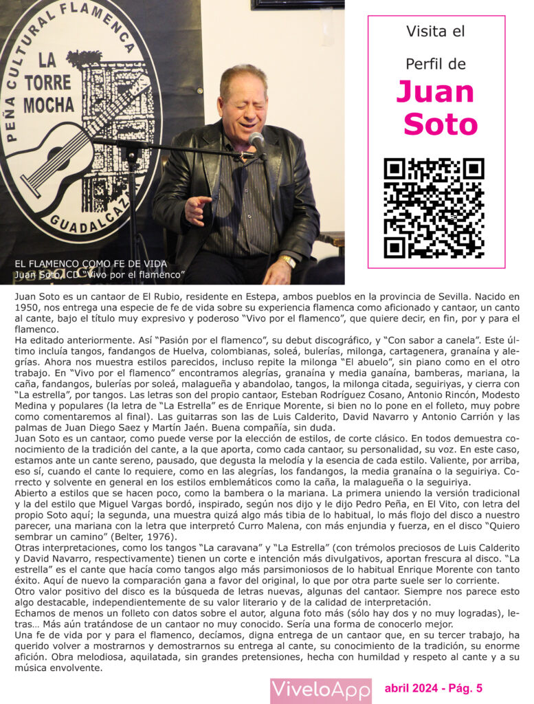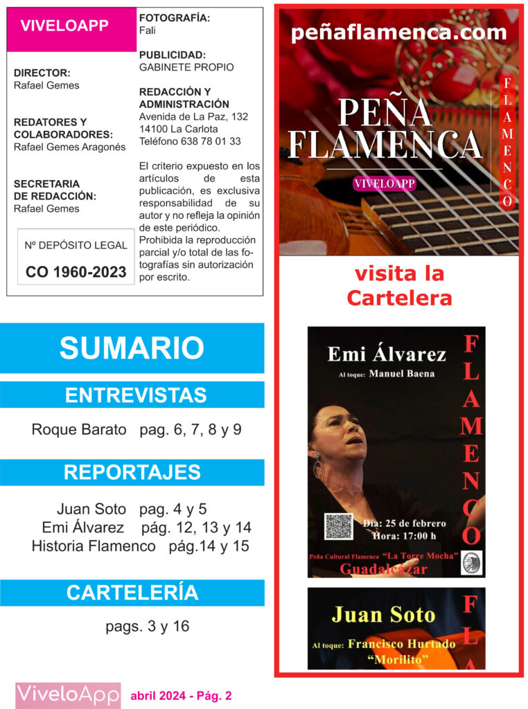 La revista de abril 2024 ofrece a los lectores un recorrido completo por la actualidad flamenca. Incluye entrevistas exclusivas a artistas reconocidos, artículos de análisis sobre el panorama actual del flamenco y colaboraciones literarias que aportan valor cultural. También recoge crónicas de los eventos más recientes organizados en Guadalcázar. Además, presenta una cuidada selección de imágenes que reflejan la actividad de la peña y transmiten el pulso cultural de la localidad.